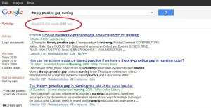 But if integrating research and teaching can be challenging then getting research findings out of universities’ doors for the benefit of all is harder still. In the health and social care fields the publication of findings in peer reviewed journals comes with no guarantee that these will be read, or used to inform anything which happens outside of academia. In nursing (and I imagine in many other practitioner disciplines too) this has often been seen as part of the ‘theory/practice gap’ problem. Nurses have spent a long time agonising over this, and typing some suitable search terms into Google Scholar produces some 200,000 documents (that’s the slightly obscured number circled in red in this screenshot) evidently devoted to its examination: