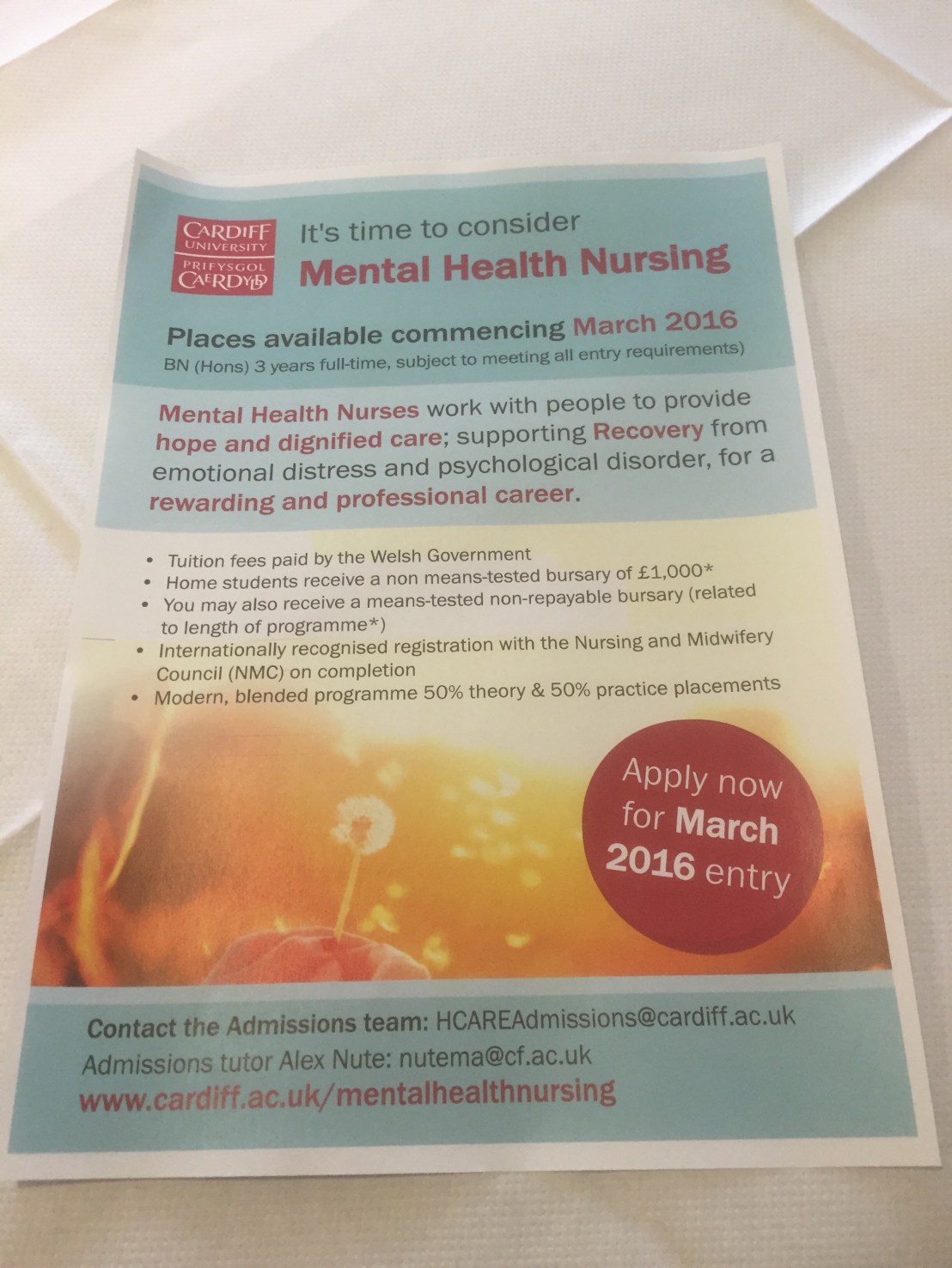 …for anyone wanting to become a mental health nurse, worth noting is that the School of Healthcare Sciences still has some places available for the BN Hons programme commencing in March 2016. The photo here, of a flyer brought to yesterday’s event, gives more information.