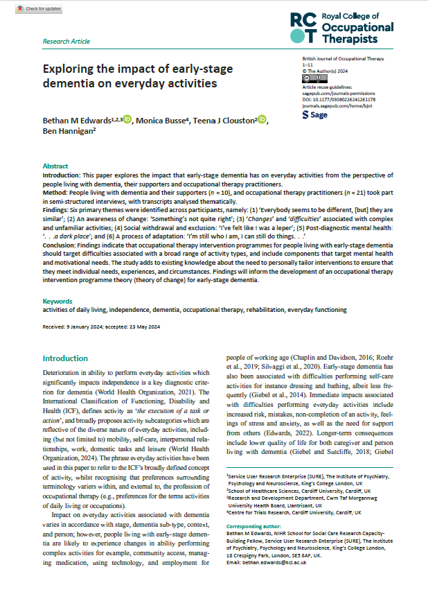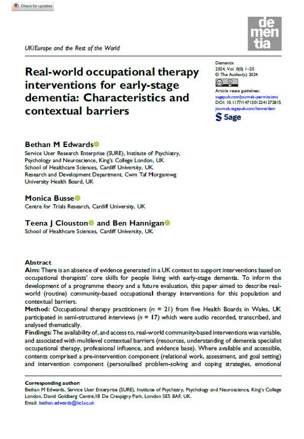 Here are links to two new papers led by Bethan Edwards, arising from her PhD which she completed in the School of Healthcare Sciences in Cardiff in 2022. Bethan is now working as a Capacity-Building Fellow at King’s College London, and her doctorate focused on the creation of an occupational therapy intervention for people living with early-stage dementia.