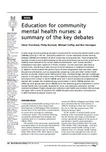 A wide range of post-qualifying education courses exist for community mental health nurses (CMHNs) working in the UK. ‘Specialist practitioner’ courses emphasize shared learning between CMHNs and members of other community nursing branches. These programmes typically include course content drawing on the social and behavioural sciences, as well as on material more tailored to the clinical needs of practitioners. Such courses and their predecessors have been subject to criticism, however. Courses have been described as anachronistic, and failing to take account of recent advances in treatment modalities. In addition concerns about the generic focus of some programmes have also been raised. Educational alternatives, such as programmes preparing nurses and other mental health workers to provide ‘psycho-social interventions’ have, correspondingly, become increasingly popular. In this paper we explore some of the debates surrounding the education of CMHNs, and explore the context in which CMHNs work and in which educational programmes are devised. We consider the multidisciplinary environment in which CMHNs practise, the differing client groups with which CMHNs work, the developing policy framework in which mental health care is provided, demands for more user-responsive education, and the relationship between higher educational institutions and health care providers. We conclude the paper with a series of questions for CMHN educators and education commissioners.