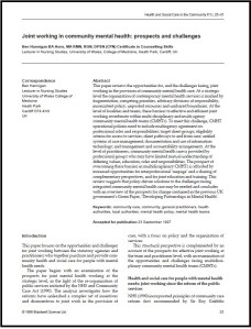 This paper reviews the opportunities for, and the challenges facing, joint working in the provision of community mental health care. At a strategic level the organization of contemporary mental health services is marked by fragmentation, competing priorities, arbitrary divisions of responsibility, inconsistent policy, unpooled resources and unshared boundaries. At the level of localities and teams, these barriers to effective and efficient joint working reverberate within multi-disciplinary and multi-agency community mental health teams (CMHTs). To meet this challenge, CMHT operational policies need to include multiagency agreement on: professional roles and responsibilities; target client groups; eligibility criteria for access to services; client pathways to and from care; unified systems of case management; documentation and use of information technology; and management and accountability arrangements. At the level of practitioners, community mental health care is provided by professional groups who may have limited mutual understanding of differing values, education, roles and responsibilities. The prospect of overcoming these barriers in multidisciplinary CMHTs is afforded by increased opportunities for interprofessional ‘seepage’ and a sharing of complementary perspectives, and for joint education and training. This review suggests that policy-driven solutions to the challenges facing integrated community mental health care may be needed and concludes with an overview of the prospects for change contained in the previous UK government’s Green Paper, ‘Developing Partnerships in Mental Health’.