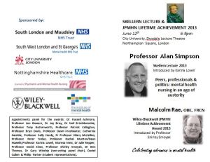 The NPNR conference is also the place where the following year’s JPMHN Lifetime Achievement Award winner and Skellern lecturer are announced. Very big congratulations to Ian Norman (who, as it happens, was one of my PhD examiners) and to Marion Janner, both of whom will be delivering their addresses at Nottingham University on June 11th 2015.